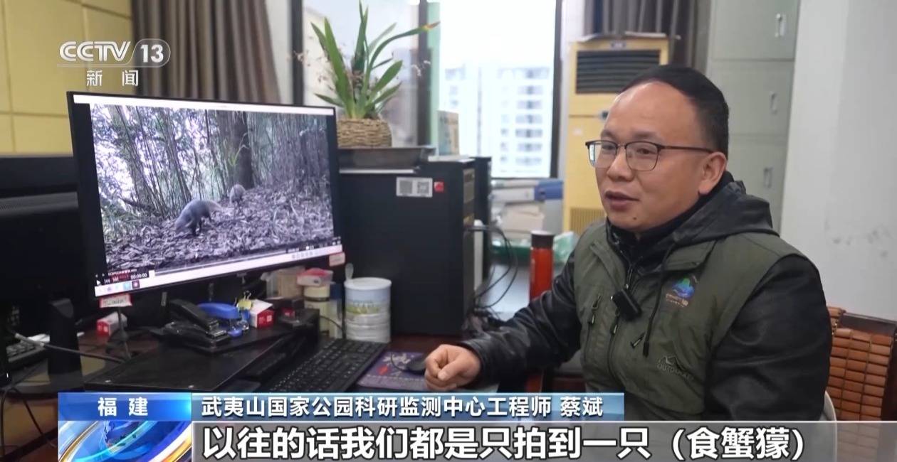 武夷山国度公园科研监测中心工程师 蔡斌:以往的话咱们齐是只拍到一只食蟹獴,况且有的期间是在夜间拍摄到,这次在日间的期间拍到了三只食蟹獴在这里看成,这个是相比穷苦的。